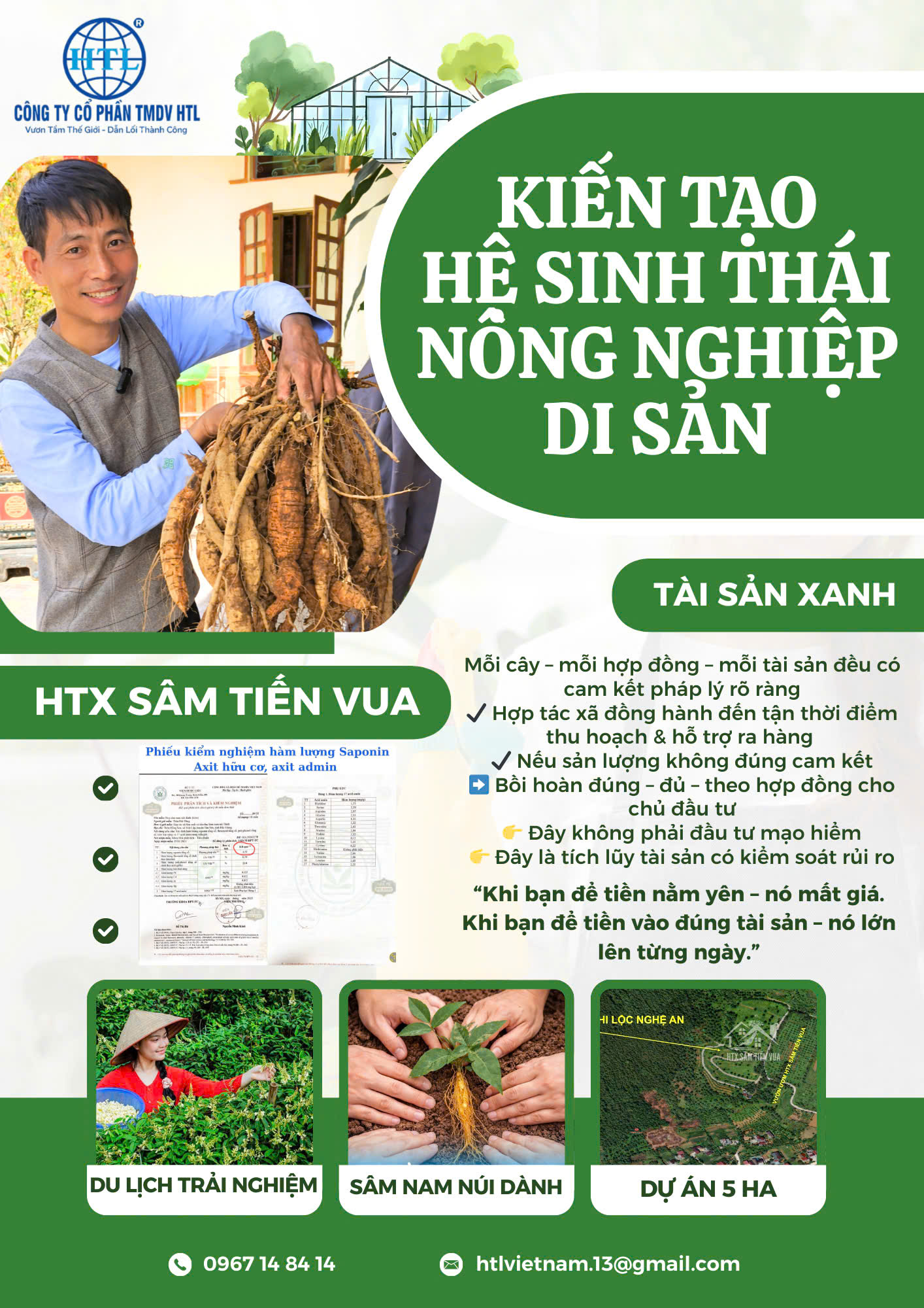 Là doanh nghiệp tiên phong trong lĩnh vực phát triển, phân phối và ứng dụng công nghệ xanh vào nông nghiệp bền vững, đặc biệt là trồng và thương mại hóa cây Sâm Núi Dành – loại cây được mệnh danh là “Sâm tiến vua”. Với tầm nhìn “Xanh hóa tương lai – Lan tỏa giá trị bền vững”, Cty CP TMDV HTL không chỉ cung cấp giống cây chất lượng cao, mà còn phát triển chuỗi giá trị khép kín từ trồng trọt, chế biến đến phân phối các sản phẩm từ Sâm Tiến Vua. Chúng tôi cam kết mang đến sản phẩm tự nhiên, giá trị kinh tế cao, thân thiện với môi trường, góp phần thúc đẩy nông nghiệp công nghệ cao và phát triển xanh tại Việt Nam cũng như thị trường quốc tế.